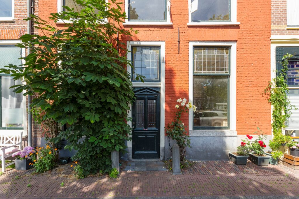 De toegangsdeur bevindt zich in het midden van de gevel, wat vrij bijzonder is voor deze monumentale woning. Dit geeft de woning een extra voornaam voorkomen en zorgt voor een symmetrische indeling met centrale hal met kamers aan weerszijden. De bovenramen aan de voorzijde zijn alle voorzien van glas-in-lood en aan de binnenzijde zijn op diverse plekken terrazzo-vloeren en oudere tegelvloeren en -wanden aanwezig.